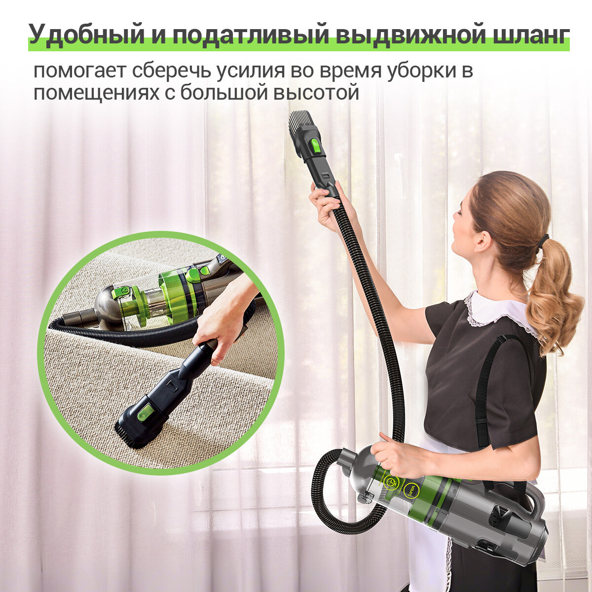 Для удобства использования пылесос был изготовлен с учетом эргономичного дизайна и облегченной конструкции, вес и длина пылесборника могут поворачиваться на 360°, что позволяет не уставать даже во время длительной уборки.