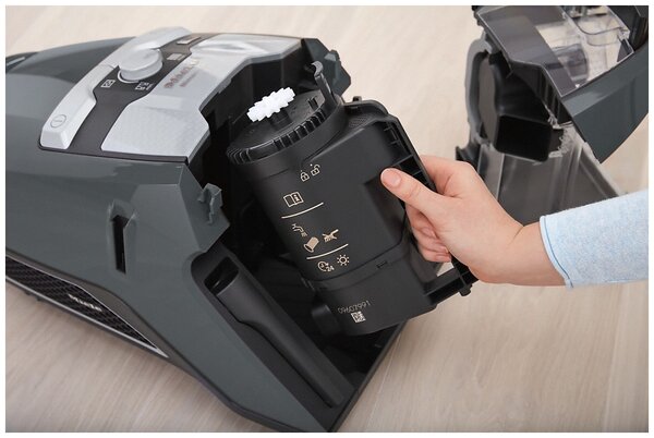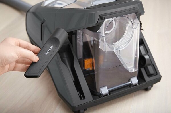 ножной переключатель вкл./выкл., место для хранения насадок, вертикальная парковка, индикатор заполнения пылесборника, регулятор мощности на корпусе