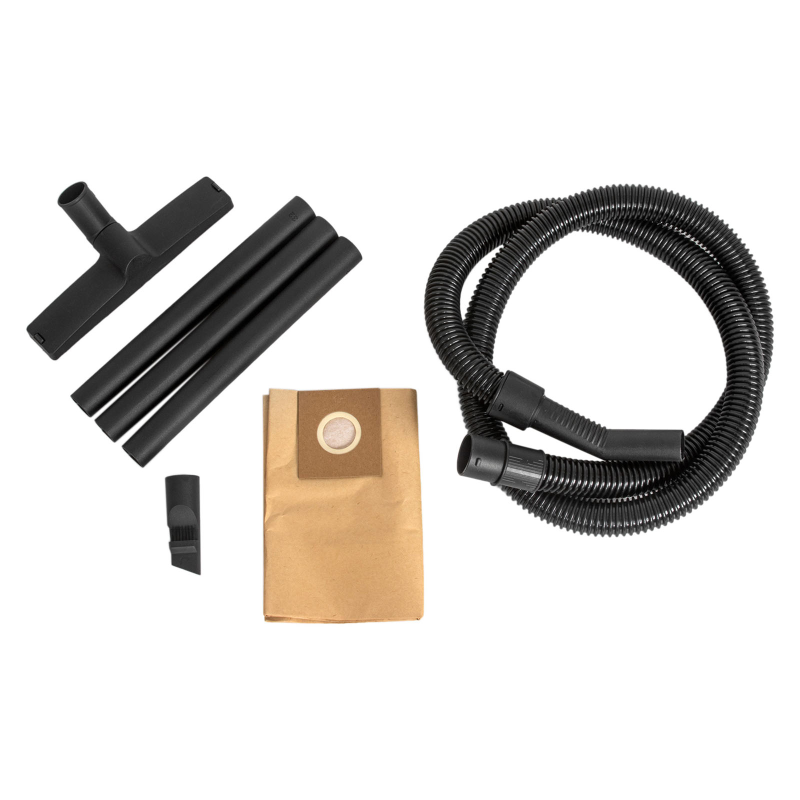 пылесос в сборе, гибкий шланг, составная пластмассовая удлинительная трубка, тканевый фильтр, бумажный фильтр, щетка для сухой и влажной уборки, щелевая насадка 2-в-1, руководство по эксплуатации