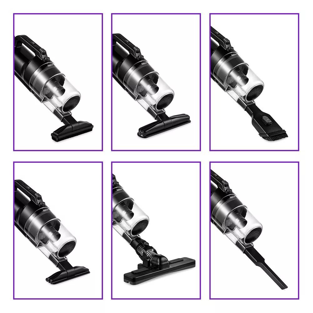 В комплекте к вертикальному пылесосу идёт набор из насадок для совершенно разных случаев уборки. Пылесос комплектуется 6 насадками: напольной и широкой ворсовой щёткой, щёткой для мебели и щёткой с микрофиброй, а также узкой насадкой и насадкой «2 в 1».