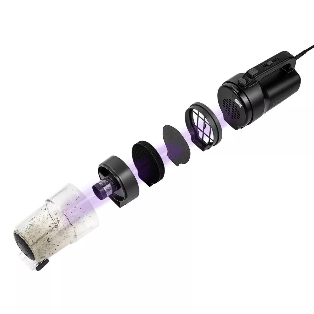 Пылесос оборудован циклонным фильтром, обеспечивающим качественную очистку. Пылесборник ёмкостью 0,5 л легко снимается и чистится. В нём находится фильтр грубой очистки, поролоновый и тканевый фильтры, которые также легко можно вынуть и почистить.