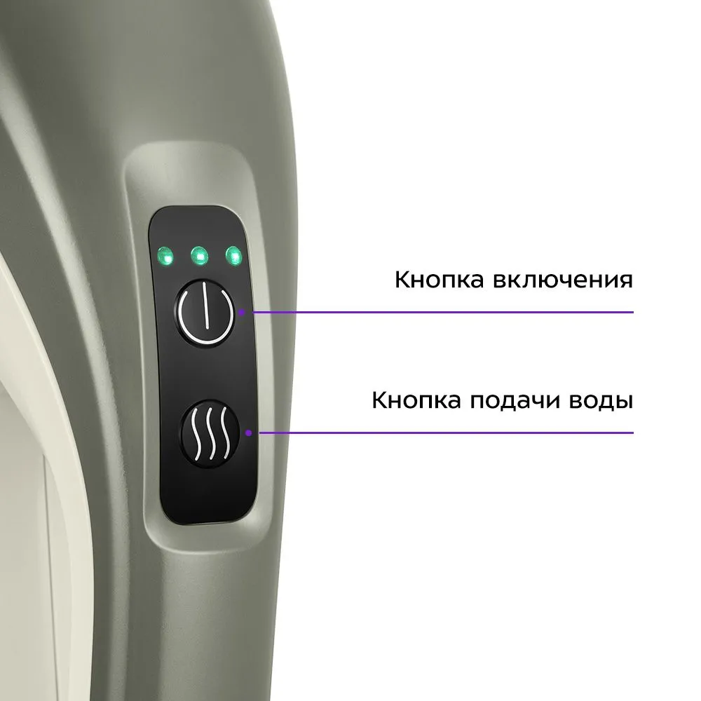 После нажатия на кнопку включения загорается подсветка, а также на секунду загораются зелёным три индикатора заряда над кнопкой включения. Вода подаётся при нажатии на кнопку подачи воды.
