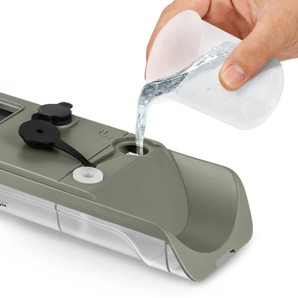 Резервуар для воды съёмный и имеет 2 отсека: для чистой и грязной воды. Из отсека для чистой воды пылесос распыляет воду на поверхность, которую вы собираетесь очистить, затем эту воду пылесос засасывает, и она поступает в отсек для грязной воды.