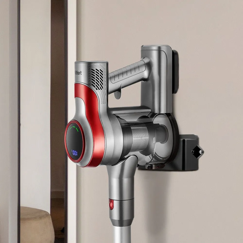 Зафиксируйте пылесос на кронштейне на стене. Так пылесос займёт меньше места при хранении и не упадёт, если вы случайно его заденете.