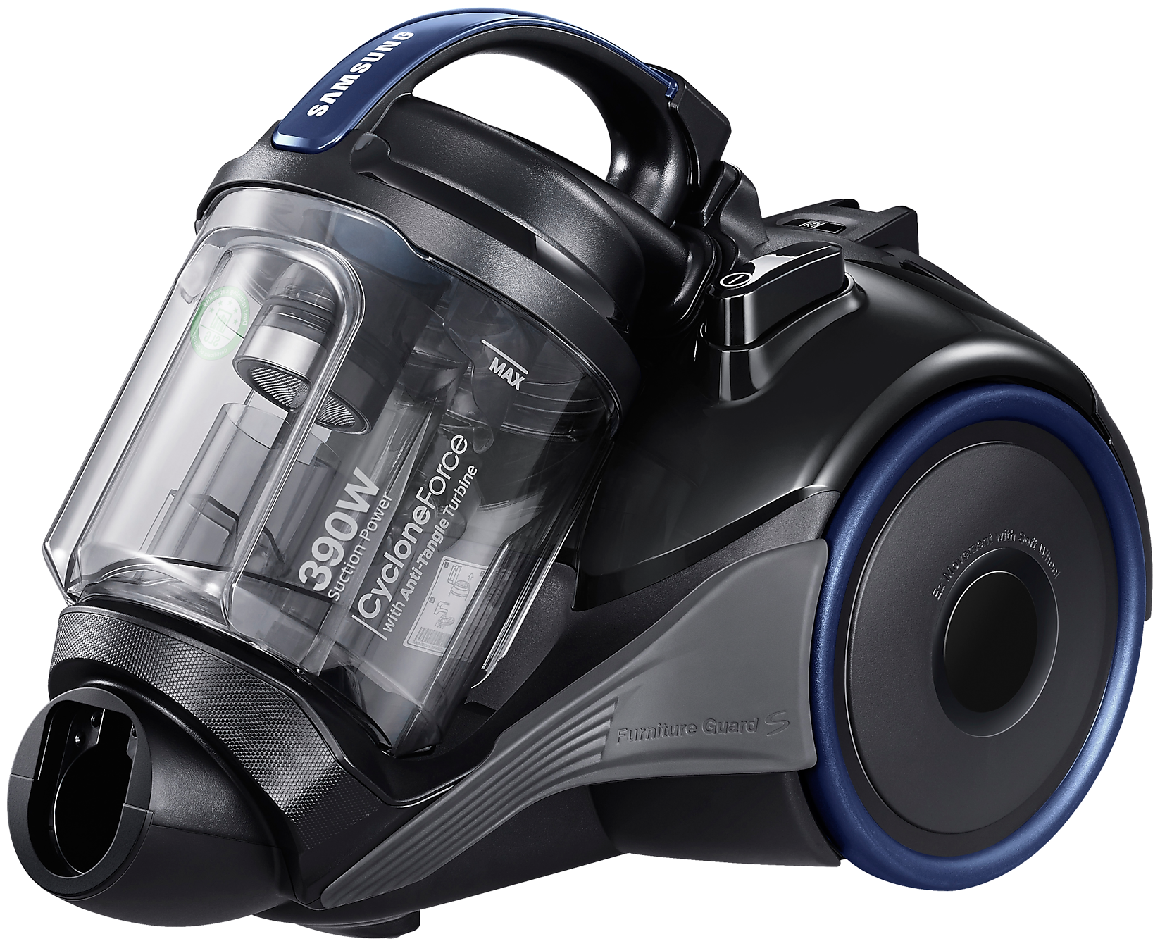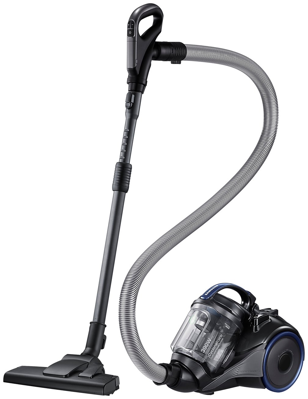 ножной переключатель вкл./выкл., мягкий бампер, индикатор заполнения пылесборника, управление мощностью на рукоятке