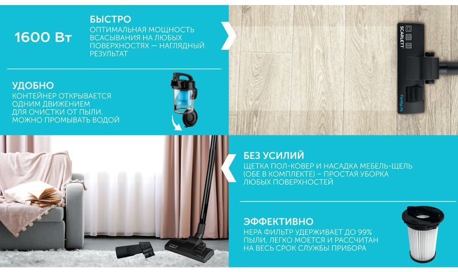 Пылесос с технологией Циклон SCARLETT SC-VC80C93 мощностью 1600 Вт станет незаменимым помощником дома всегда максимальная мощность всасывания в процессе уборки. Оптимальная мощность всасывания на любых поверхностях позволяет добиться наглядного результата.