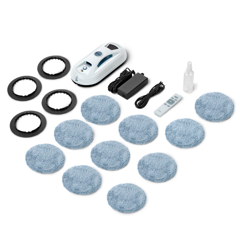аккумулятор, зарядная станция, моющая тряпка, пульверизатор, пульт ДУ, страховочный шнур, удлинитель сетевого шнура, Робот для мойки окон, батарейки ААА - 2 шт., блок питания, бутылка для воды с распылителем, держатель тряпки - 4 шт., страховочный тросс с карабином, тряпка - 10 шт., шнур питания