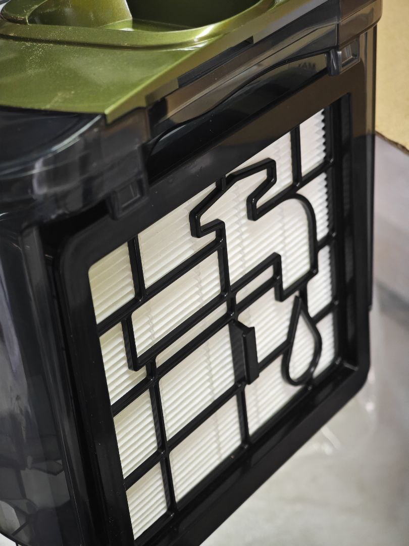 2 больших колеса, индикатор заполнения пылесборника, ручка для переноски