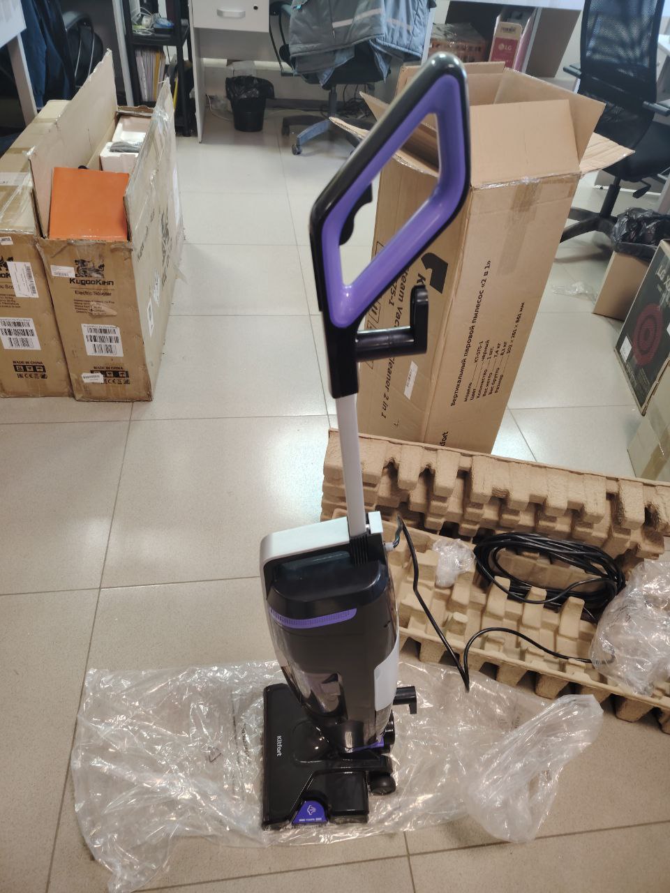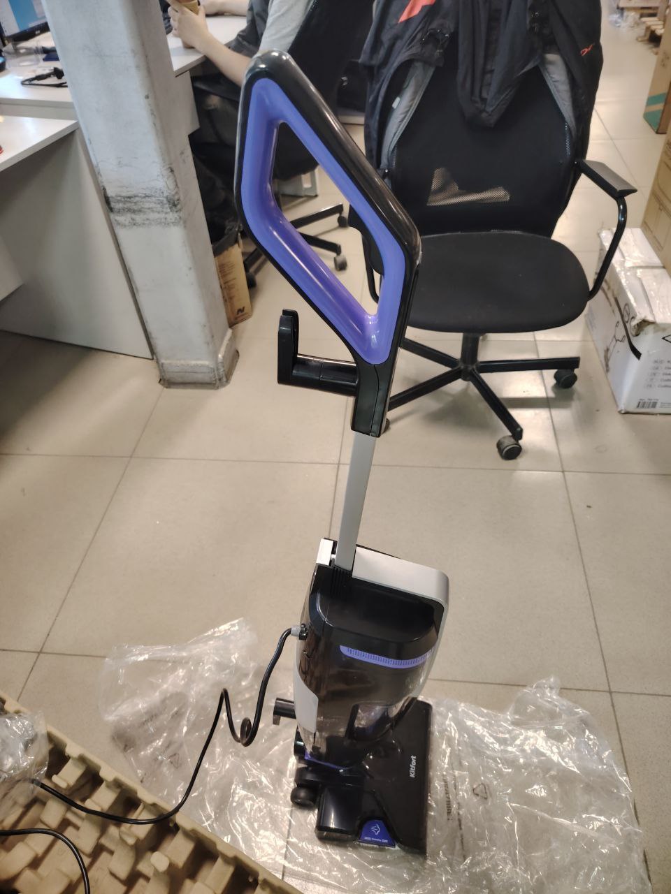 Пылесос манёвренный благодаря колёсикам и специальной конструкции щётки для пола. На щётку прибора крепится на липучках узкая тряпка, которая вытирает лишнюю влагу от основной тряпки.