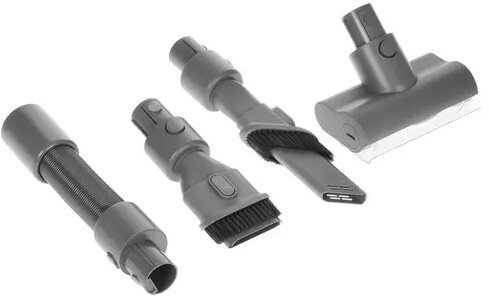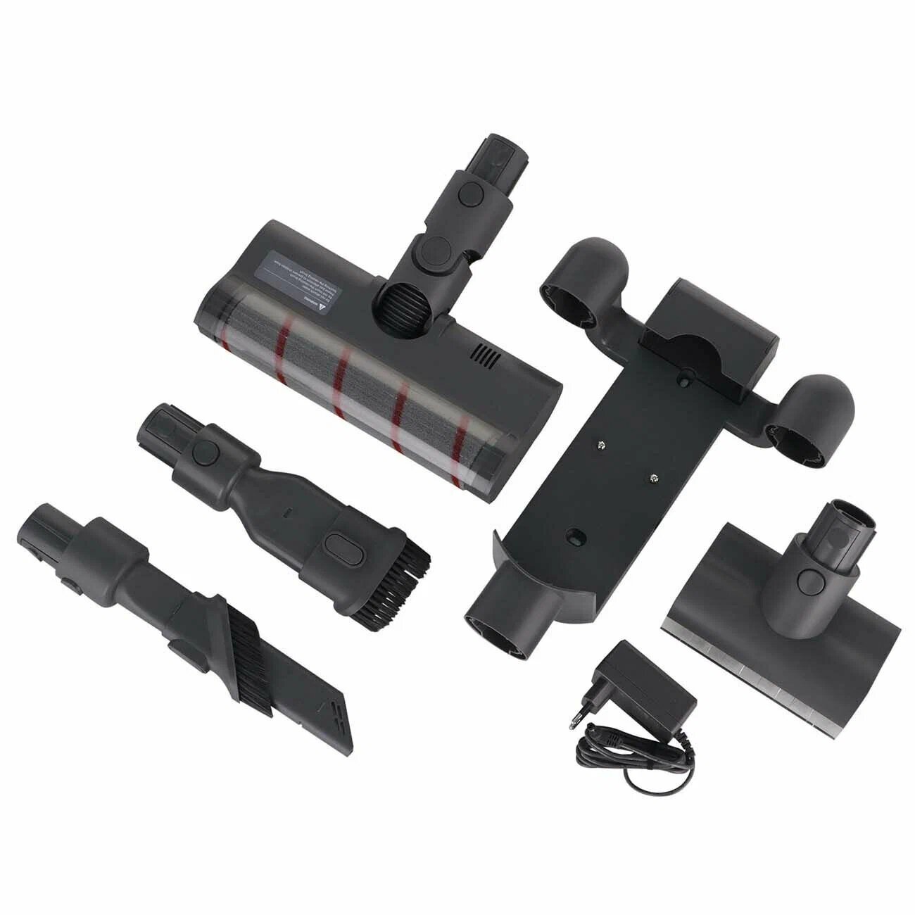 2 доп насадки, Пылесос, блок питания, металлическая трубка, подставка для зарядки, станция, труба алюминиевая, труба гнущаяся, удлинительная трубка, щетка для ковров, щетка основная