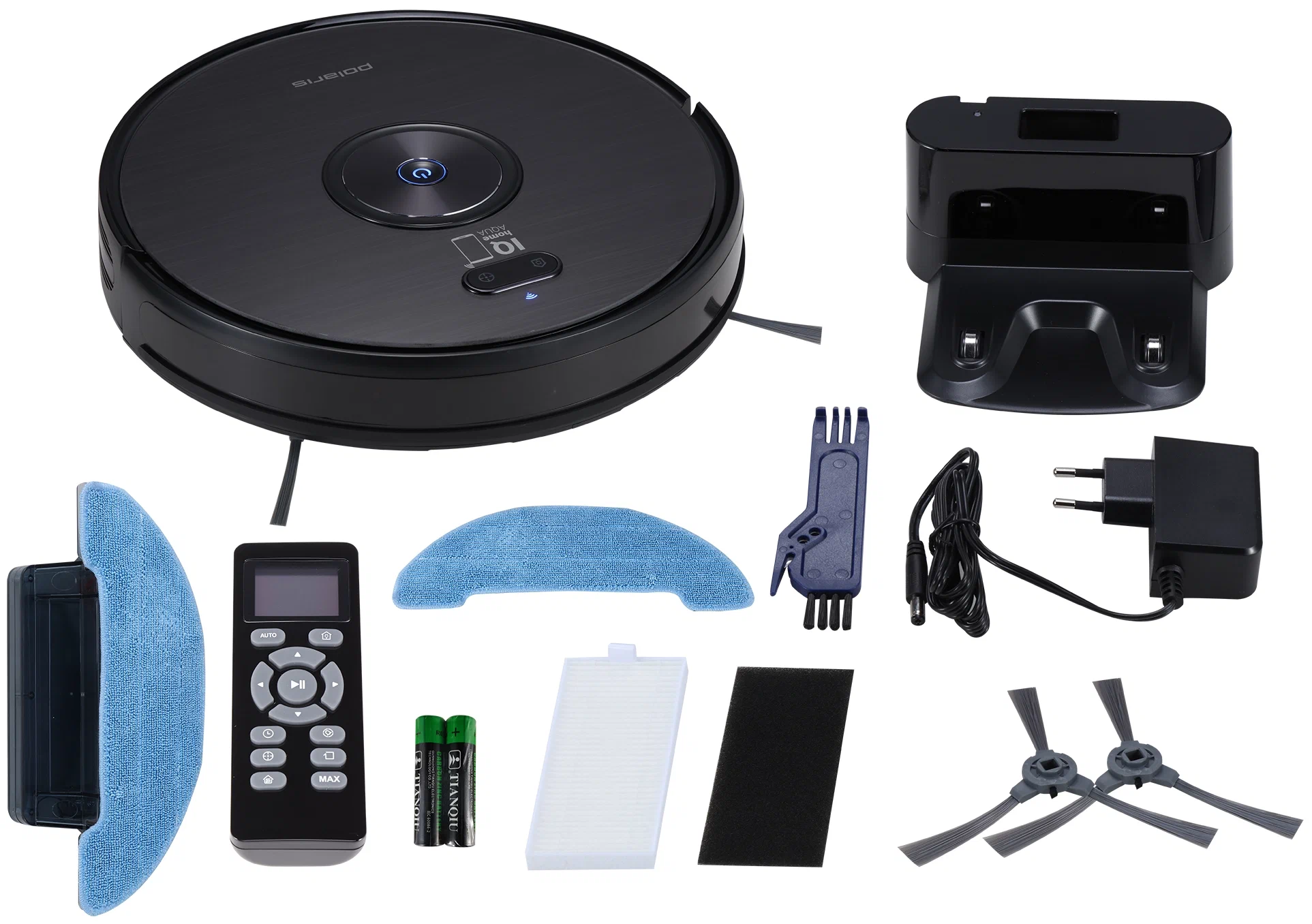 площадь уборки на одной зарядке 150 м², в комплекте: пылесборник (установлен) - 1шт.; контейнер для влажной уборки с тряпкой – 1 шт.; АКБ (аккумуляторная батарея - установлена) - 1шт.; база для зарядки - 1шт.; батарейки AAA (входят в комплект) – 2 шт.; зарядное устройство (адаптер) - 1 шт.; боковые щетки (не установлены): 4 - шт.; запасной комплект HEPA фильтра и первичного фильтра - 1 шт.; микрофибра для влажной уборки запасная – 1шт.; пульт дистанционного управления - 1шт.; инструкция по эксплуатации - 1шт.; упаковка (полиэтиленовый пакет + коробка) - 1шт.