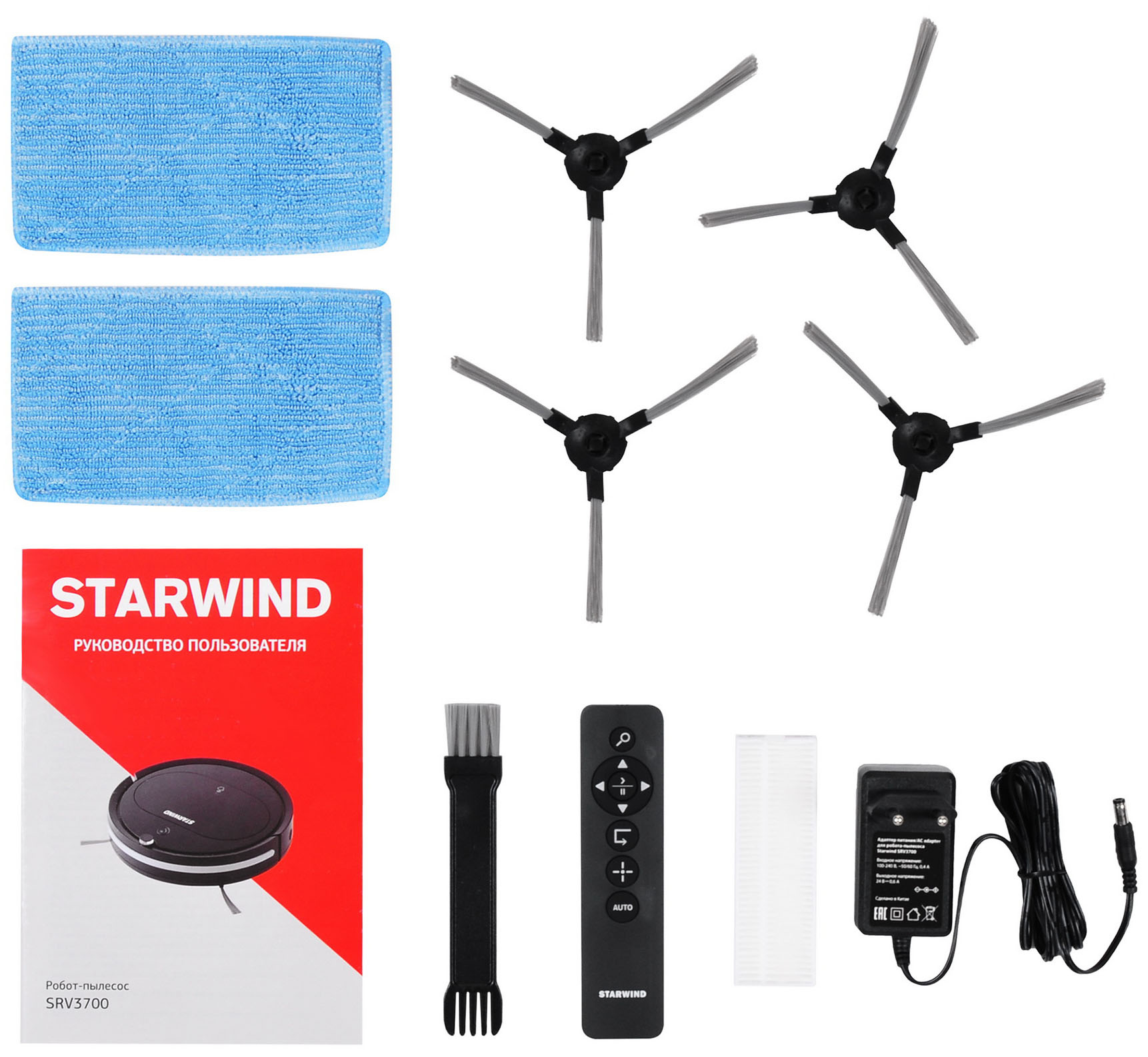 Другие насадки и принадлежности пульт ДУ сетевой адаптер боковые щетки -4 шт. сменный фильтр HEPA насадка для влажной уборки- 2 шт. щеточка для очистки пылесборника