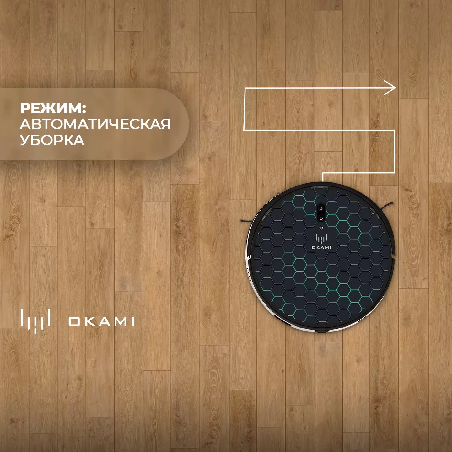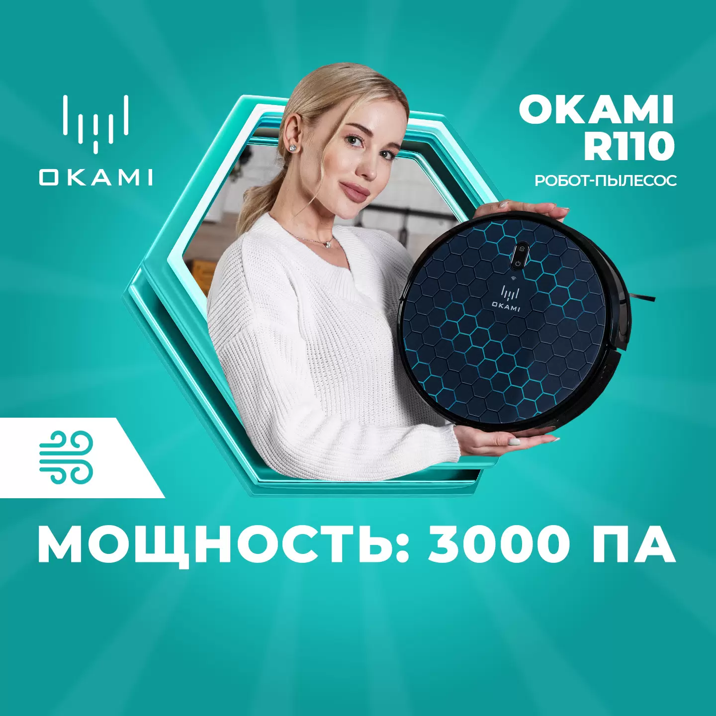 Робот-пылесос Okami R110 Пульт дистанционного управления Адаптер для зарядного устройства Зарядная станция Комбинированный контейнер для пыли и воды Воздушный фильтр HEPA-11 + губчатый: 2 шт Боковые щетки: 4 шт Кисточка для чистки контейнера Тряпочки для влажной уборки: 2 шт Инструкция на русском языке и гарантийный талон