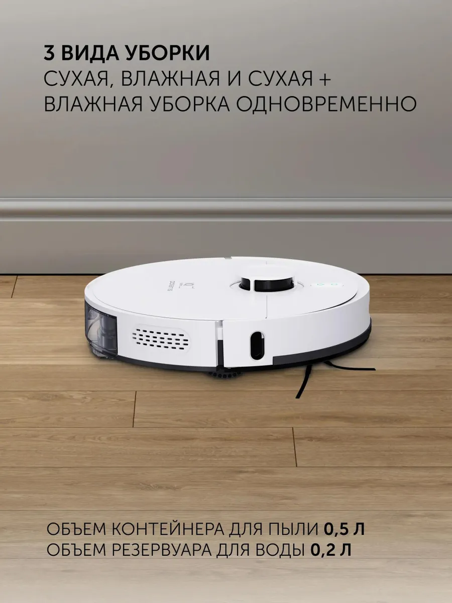 Сухая и влажная автоматическая уборка Отправка на уборку в заданной точке в 1 клик; Увеличение мощности всасывания на коврах; Время работы: до 300 минут.