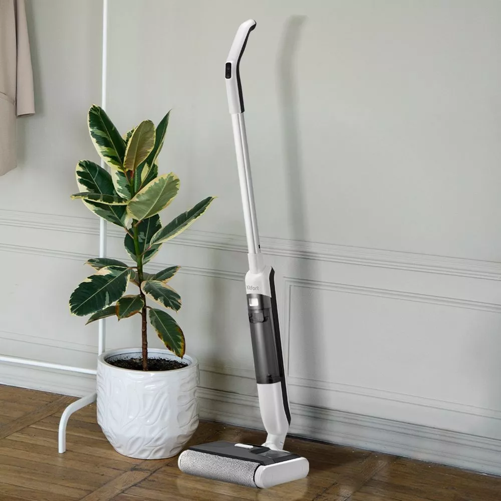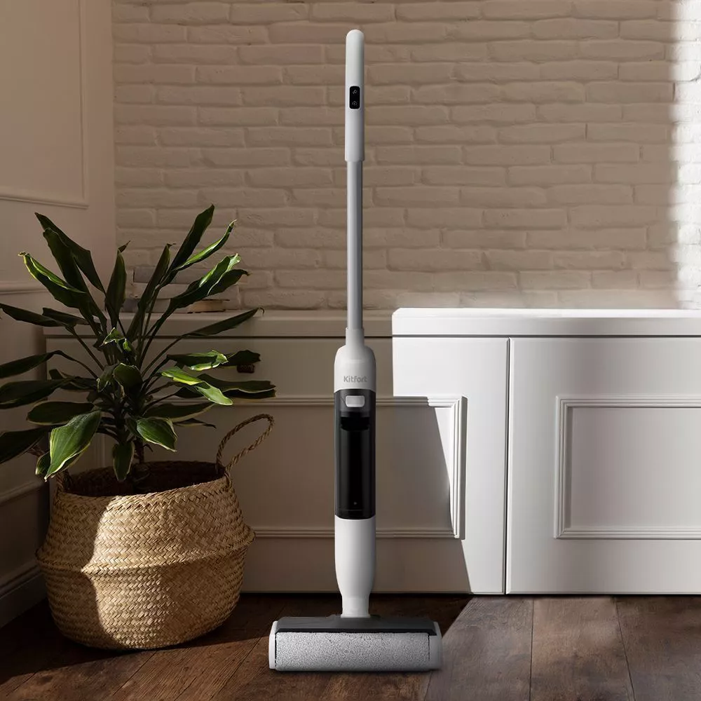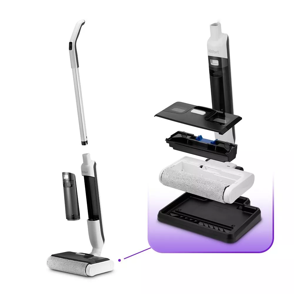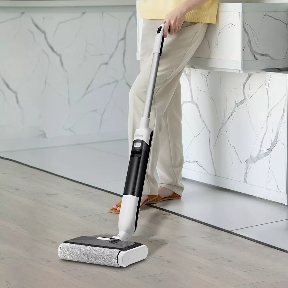 У устройства два режима работы: влажная и сухая уборка (без подачи воды). С помощью электрошвабры КТ-5224 можно убирать пролитые жидкости и влажный мусор, что не получится сделать обычным электровеником или пылесосом.