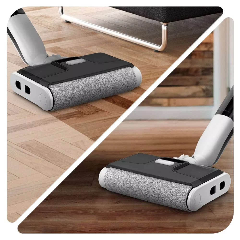Валик турбощётки покрыт микрофиброй — материалом, который хорошо впитывает воду. За счёт того, что валик турбощётки вращается и на него подается чистая вода, он самоочищается во время работы и не оставляет разводов на полу.