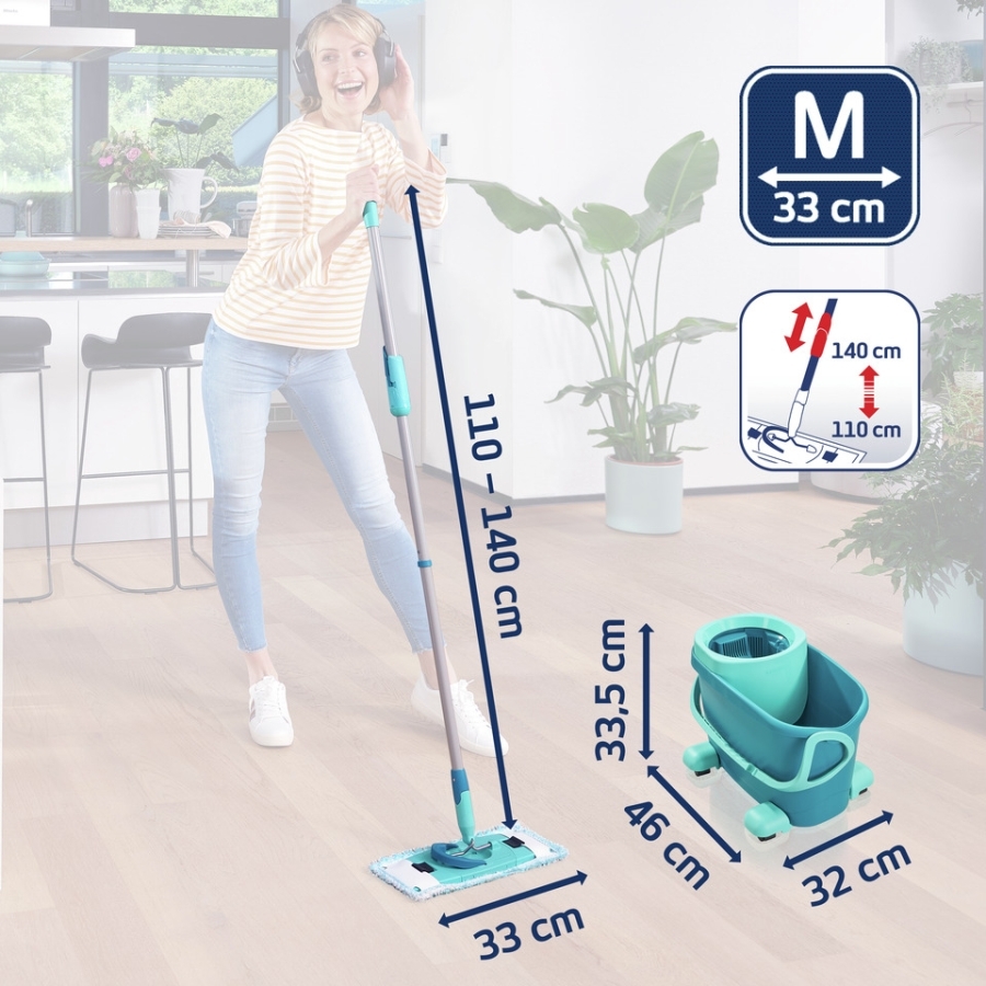 Надежный шарнир на 360° в основании, швабры служит гарантией высокого уровня комфорта при уборке, позволяет мыть пол по серпантину и в труднодоступных местах. Телескопическая рукоятка швабры регулируется по длине (110 - 140 см), создавая максимально удобную высоту для безупречной работы. Тележка с вращающимися на 360° роликами и эргономичная ручка на ведре, обеспечивают удобное перемещение системы по помещению. Ведро предусмотрительно оснащено держателем швабры и специальным носиком для слива грязной воды.