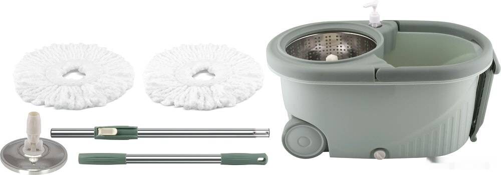 В набор для мытья полов входит ведро объёмом 7 л, вращающаяся швабра с насадкой из микрофибры, 1 запасная насадка и дозатор.