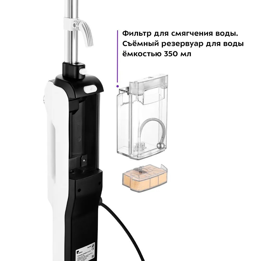 Резервуар у паровой швабры съёмный ёмкостью 350 мл, что позволяет производить непрерывную уборку от 12 до 25 минут. В резервуаре предусмотрен фильтр для очистки воды во избежание образования накипи в бойлере и разводов на полу.