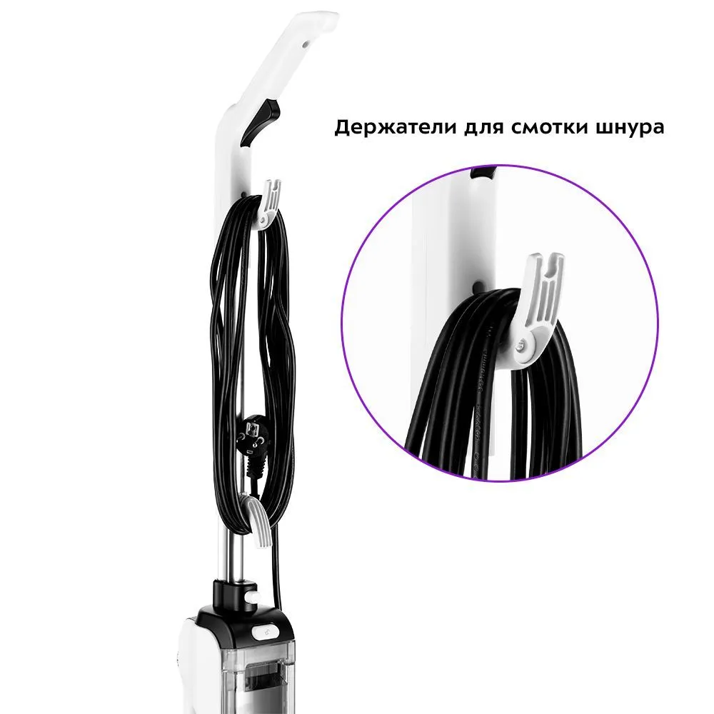 Паровая швабра обладает функцией вертикальной парковки. На удлинительной ручке предусмотрены держатели для шнура.