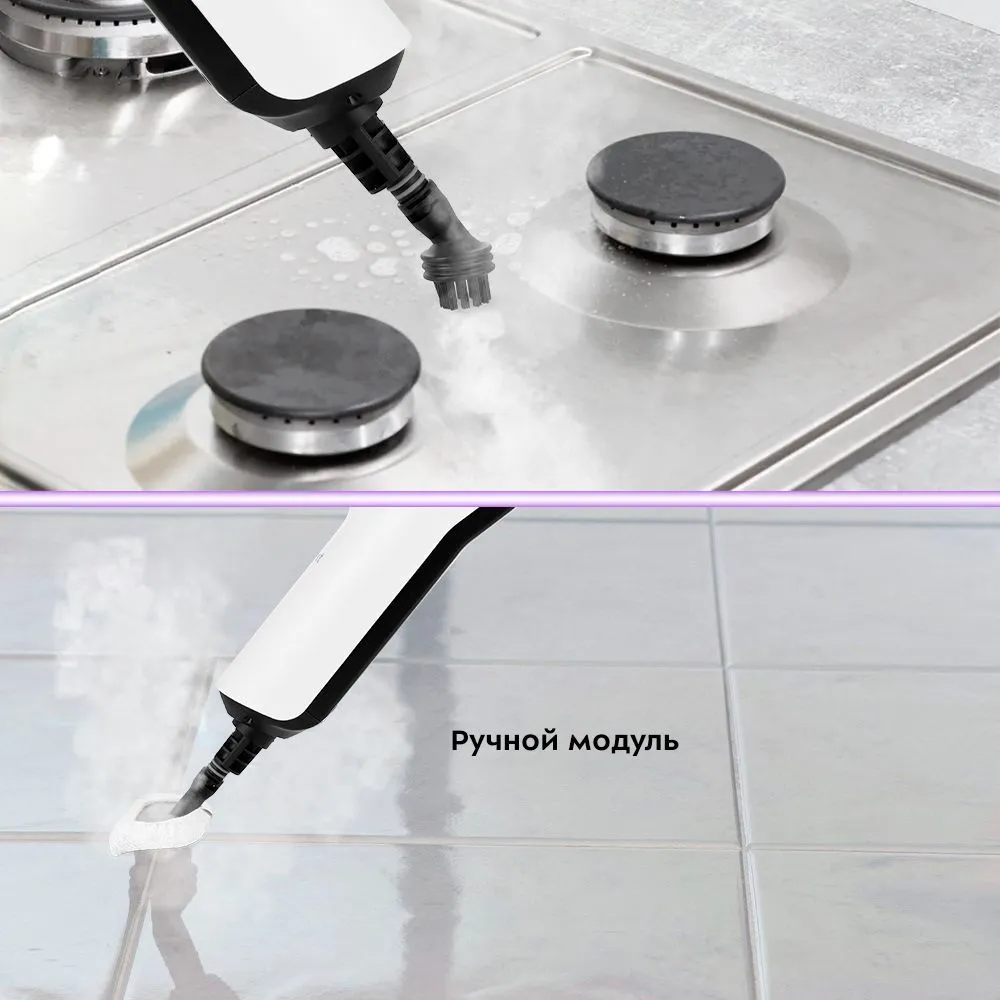 Конструкция «2 в 1» предусматривает наличие ручного модуля, который удобно использовать с насадками. Все необходимые насадки уже в комплекте. Они быстро вернут сияющий блеск вашей варочной поверхности, помогут добраться до труднодоступных мест и другое.