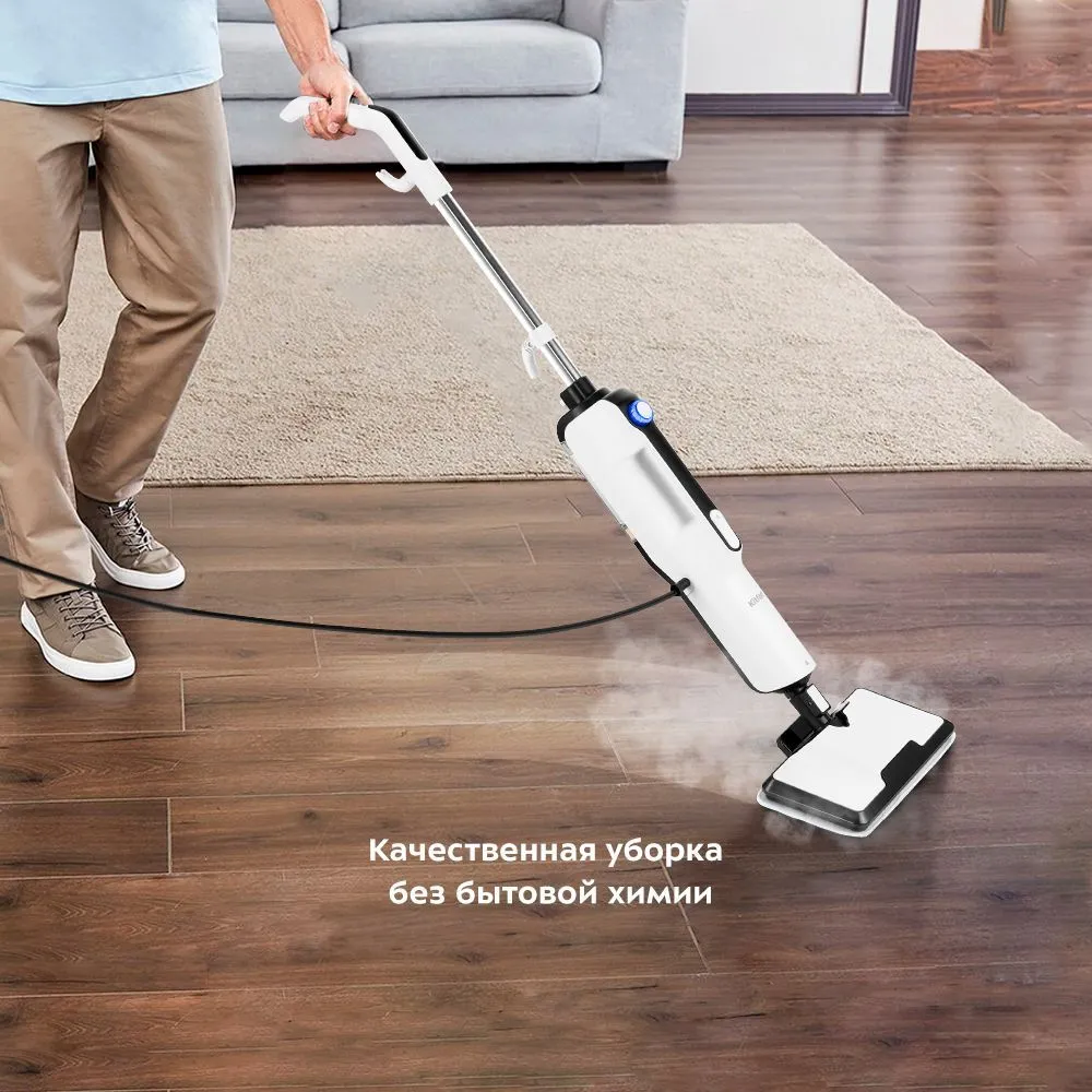 Паровая швабра обладает большим углом наклона при уборке, который поможет легко убирать пространство под мебелью. Тряпка надёжно крепится на липучках. Её можно стирать в стиральной машине при 40 °С.