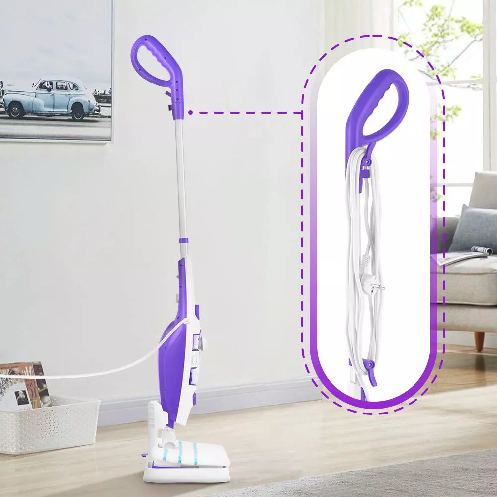 При хранении швабра не займёт много места. Шнур длиной 4,9 м не сковывает и не ограничивает ваше перемещение во время уборки. На ручке и корпусе швабры имеются держатели для смотки шнура.