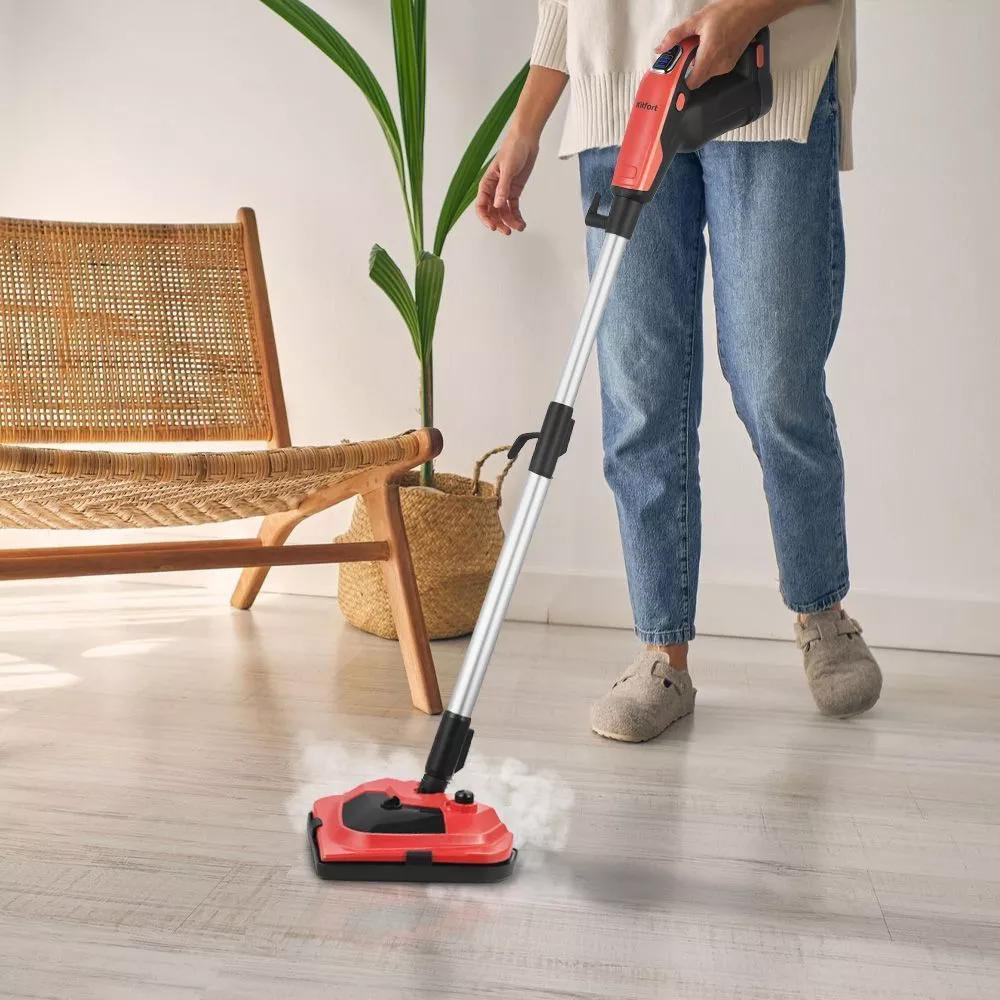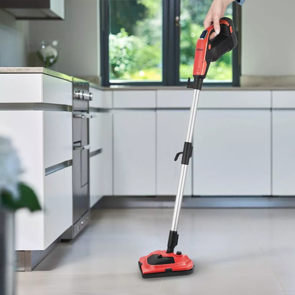 Паровая швабра КТ-1053 — универсальное устройство, которое поможет избавиться от пыли и грязи с помощью мощной струи пара, а также продезинфицирует поверхность. Высокая температура способствует процессу очистки любых загрязнений.