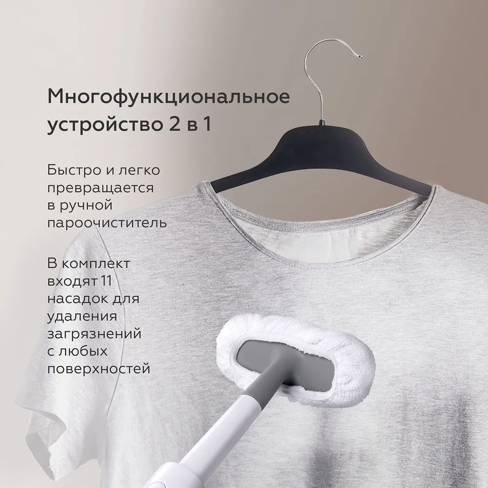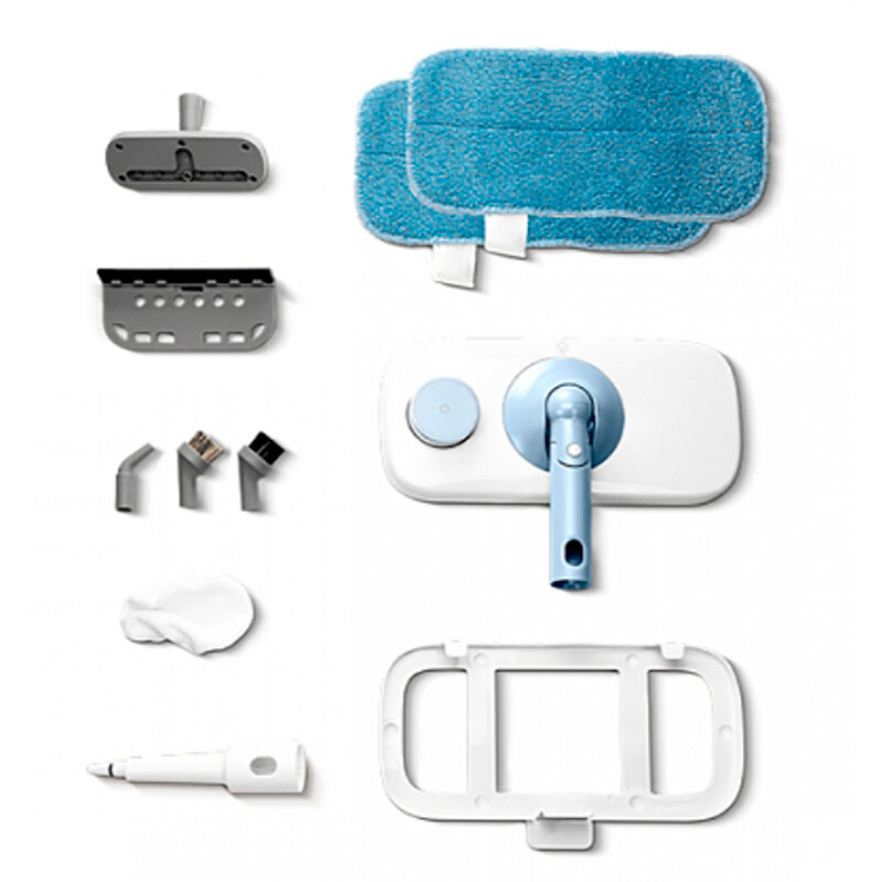 Парогенератор, удлинительные трубки (2 шт.), основная насадка, тряпка для пола, насадка для чистки ковров, адаптер для насадок, круглая щетка из микрофибры, круглая металлическая щетка, гладильная щетка-отпариватель, тряпка для отпаривания, насадка-скребок для мытья окон, струйная (угловая) насадка, коробка для хранения насадок, настенное крепление, инструкция по эксплуатации