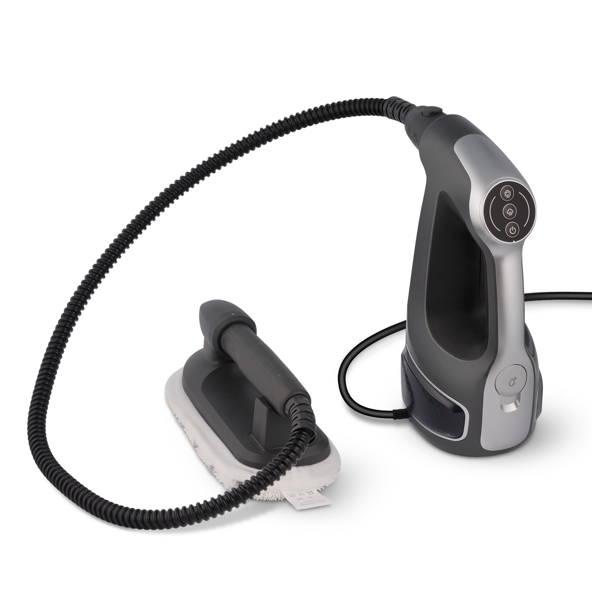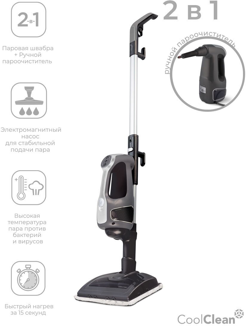 Конструкция 2-в-1 (паровая швабра плюс ручной пароочиститель). Второй режим предназначен для очищения зеркальных поверхностей, керамической плитки, а также отпаривания одежды.