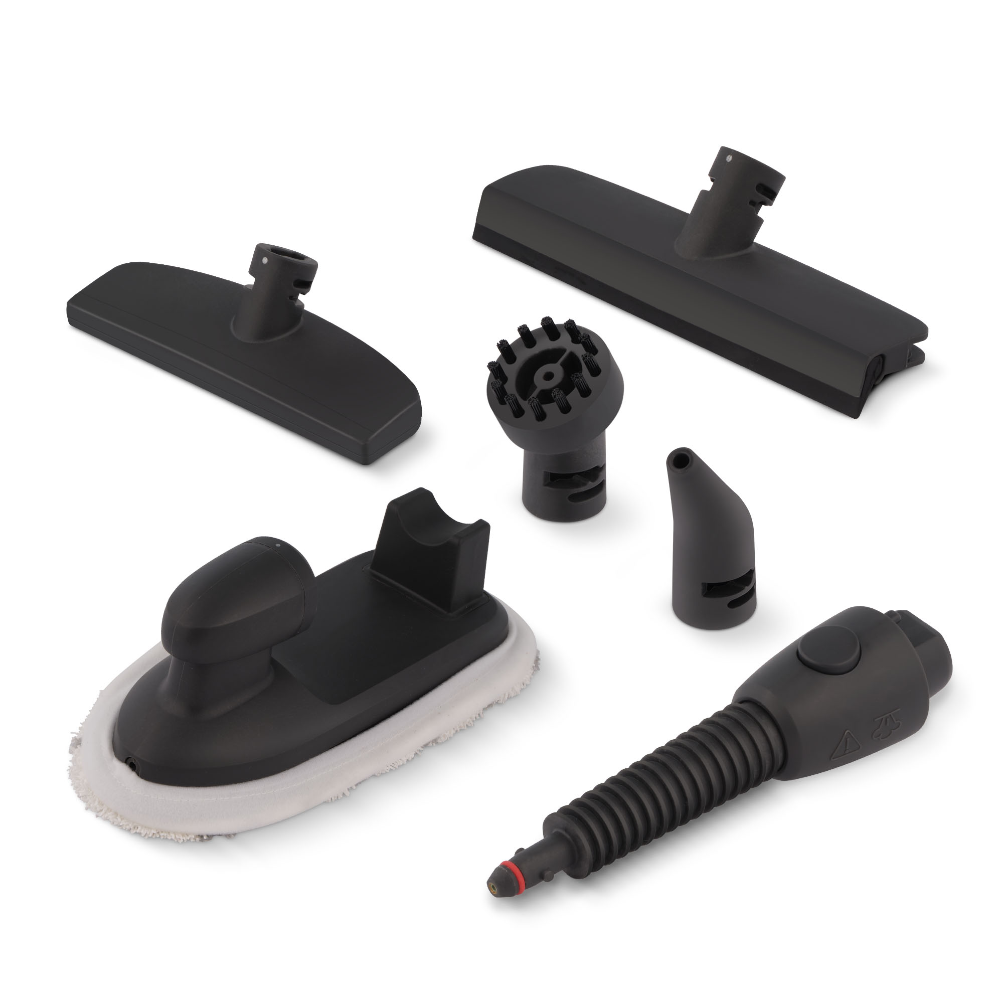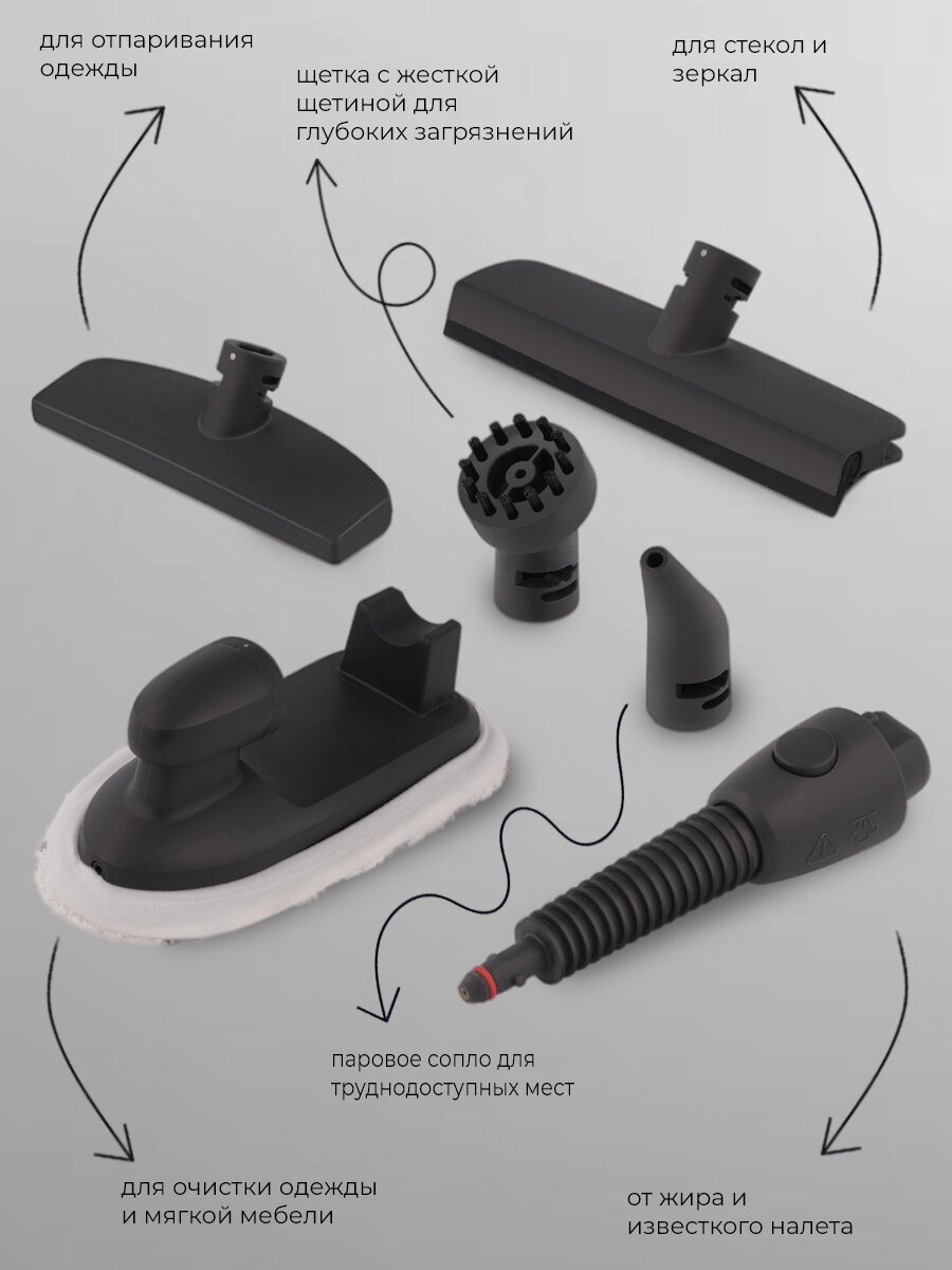 В комплект с прибором входят 6 насадок для очищения различных поверхностей, специальная тряпочка и шланг для пароочистителя.
