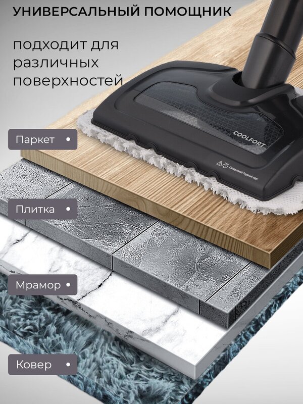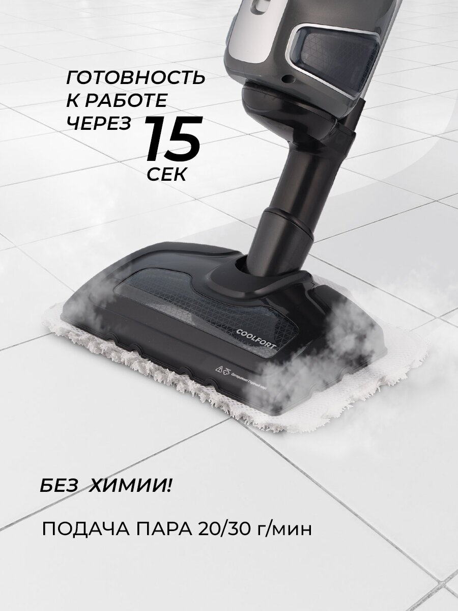 Паровая швабра CF-3101 — прибор с максимальной мощностью 1550 Вт не только очищает поверхности, но и стерилизует их, воздействуя горячим паром (20–30 г/мин). И все это — без использования моющих средств!
