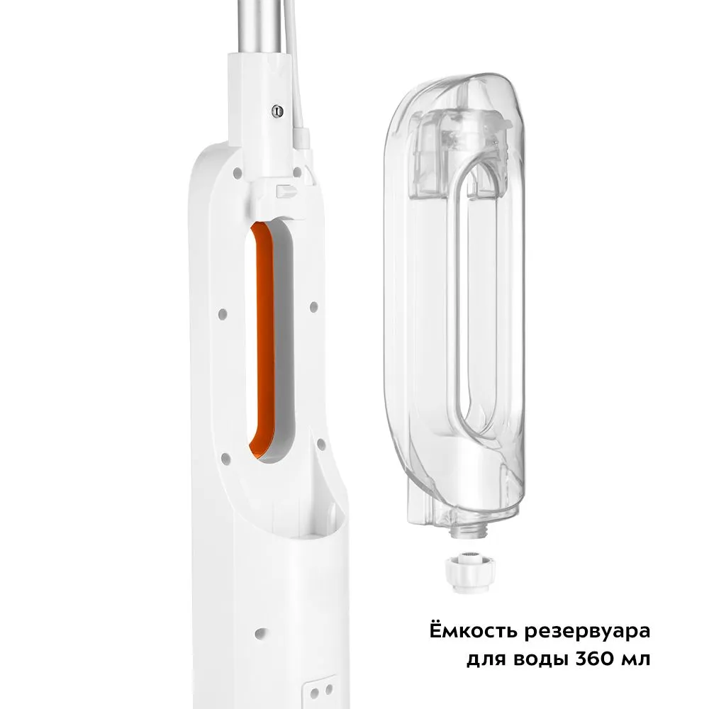 Во время работы парогенератора вода из резервуара проходит через специальный фильтр. Швабра оснащена резервуаром для воды ёмкостью 360 мл, что позволит убрать большую площадь сразу. Конструкция удобно разбирается, чтобы наполнить и вымыть резервуар.