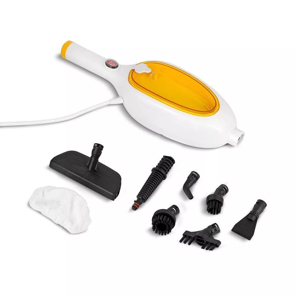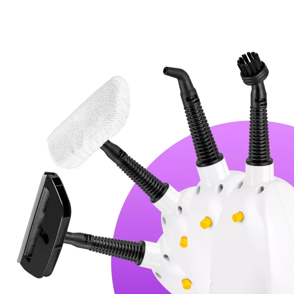 Конструкция «2 в 1» предусматривает наличие ручного модуля, который используется с насадками: плоская и круглые нейлоновые щетки, насадка для отпаривания с резиновым скребком, тряпка для отпаривания. С их помощью можно очистить любые вещи в доме.