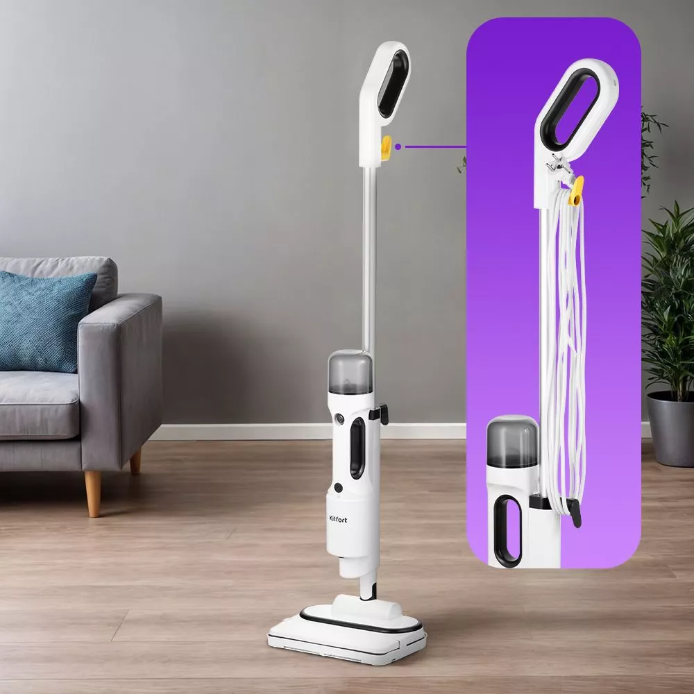 Паровая швабра обладает функцией вертикальной парковки. На удлинительной трубке предусмотрены держатели для шнура.