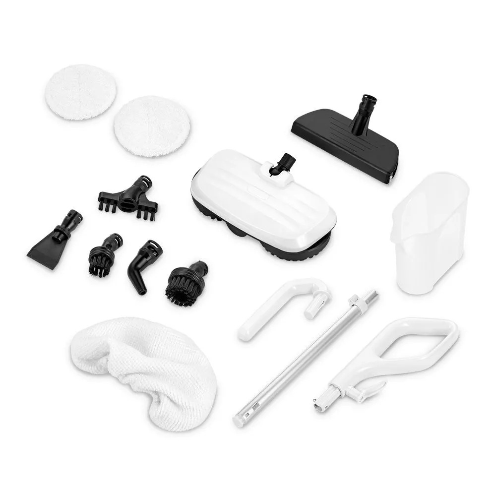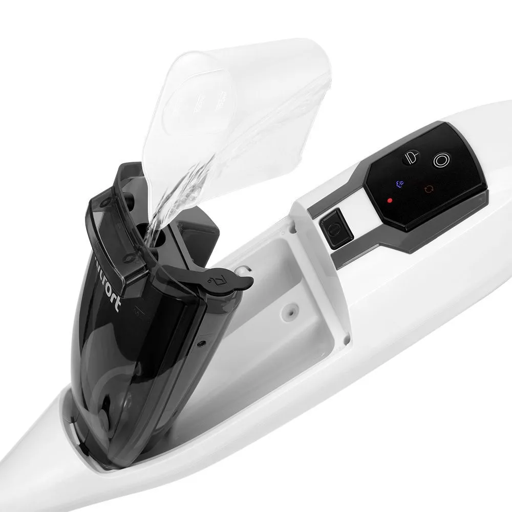 На ручке устройства находятся дисплей, кнопки включения и выбора уровня подачи пара. Три уровня подачи пара позволяют настраивать интенсивность выходящего пара. Кнопка «Напольная щётка» включает и выключает вращение дисков напольной щётки.