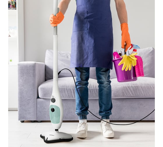 Паровая швабра обладает функцией вертикальной парковки и большим углом наклона при уборке, который поможет убрать пространство под мебелью.