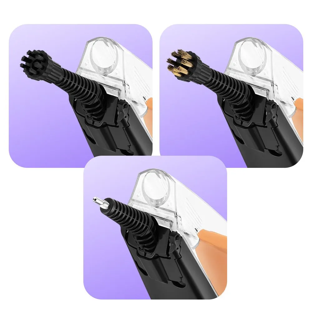 Струйная насадка предназначена для очистки углов, плинтусов, стыков между плитками и других узких мест. Нейлоновая щётка используется для удаления стойких загрязнений (смесители, кафель). Латунная щётка подходит для очистки особо сильных загрязнений.