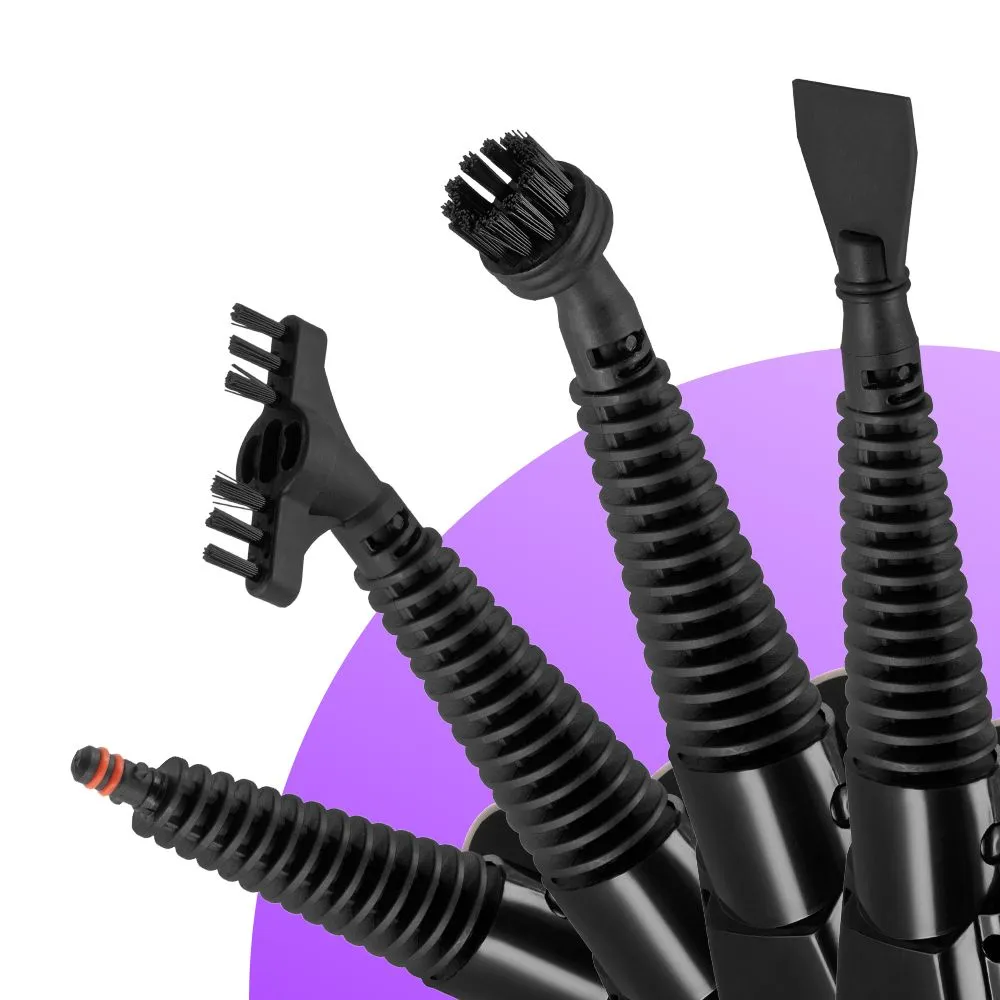 Плоская нейлоновая щётка удобна для уборки радиаторных батарей и решётчатых поверхностей, а струйная для чистки щелей и углов. Скребок подойдёт для очистки окон, зеркал и кафельной плитки. Латунная щётка поможет справиться со стойкими загрязнениями.