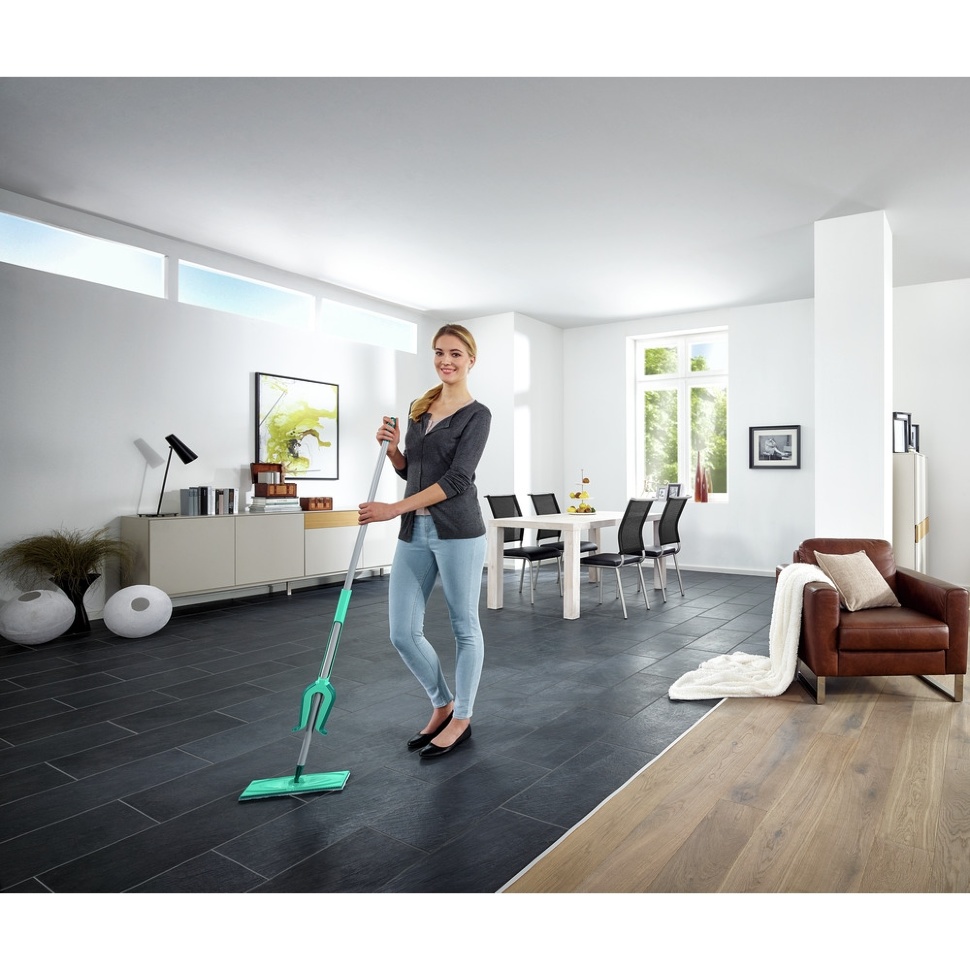 Удобная швабра, оборудованная мягкой съемной насадкой на липучке, эффективна для очищения всех видов поверхностей