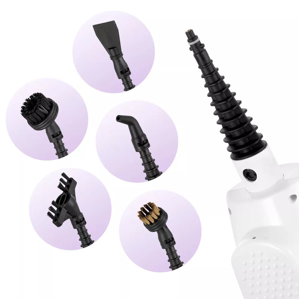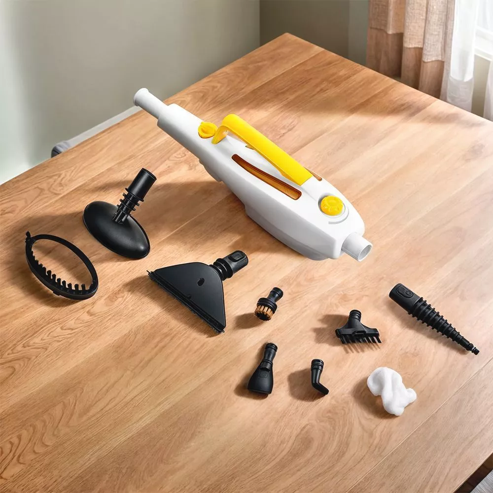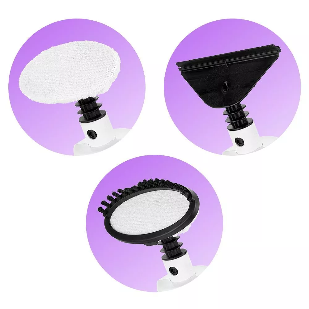 Конструкция «2 в 1» предусматривает наличие ручного модуля, который используется с насадками. Насадка со скребком используется для чистки окон и зеркал, насадка для отпаривания – для отглаживания одежды. В комплекте также есть тряпка и ворсовая насадка.