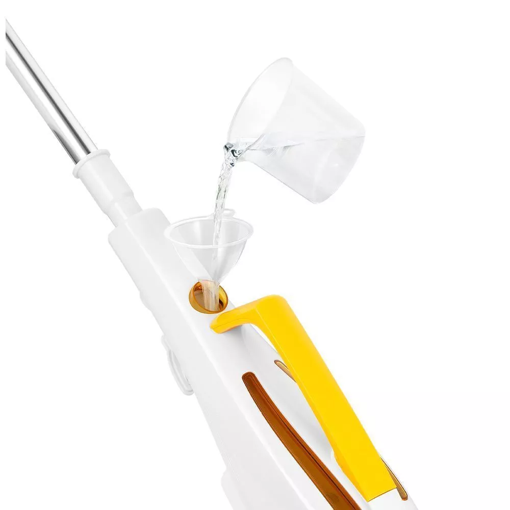 Устройство оснащено резервуаром для воды ёмкостью 400 мл, что позволяет производить непрерывную уборку до 15 минут в зависимости от уровня подачи пара. Мерный стакан позволяет отмерить нужный объём воды, а воронка поможет удобно залить её в резервуар.