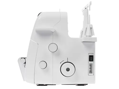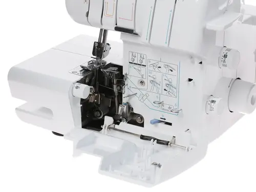 Оверлок необходим для обрабатывания края сшиваемых изделий. Устройство обладает белым корпусом из пластика.