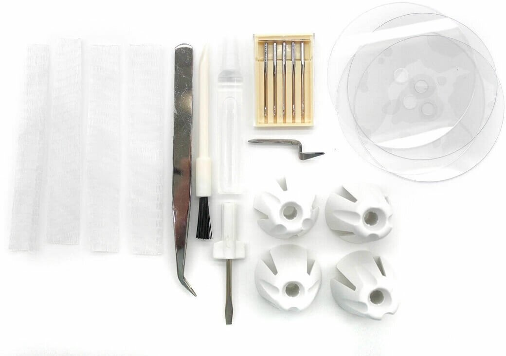 В комплекте с оверлоком идут мягкий чехол, отсек для принадлежностей, регулировка прижима ткани, отключение ножа, лоток для обрезков, цветная маркировка, контроль натяжения нитей, нитеобрезатель и другие полезные функции.