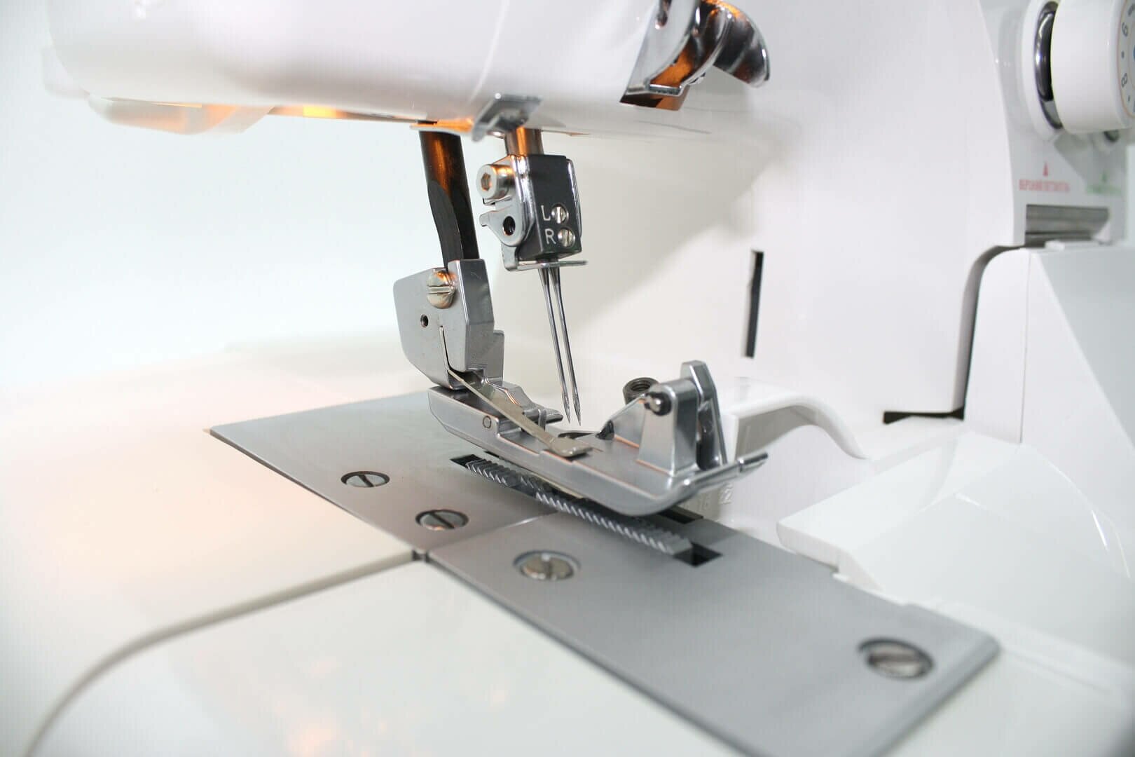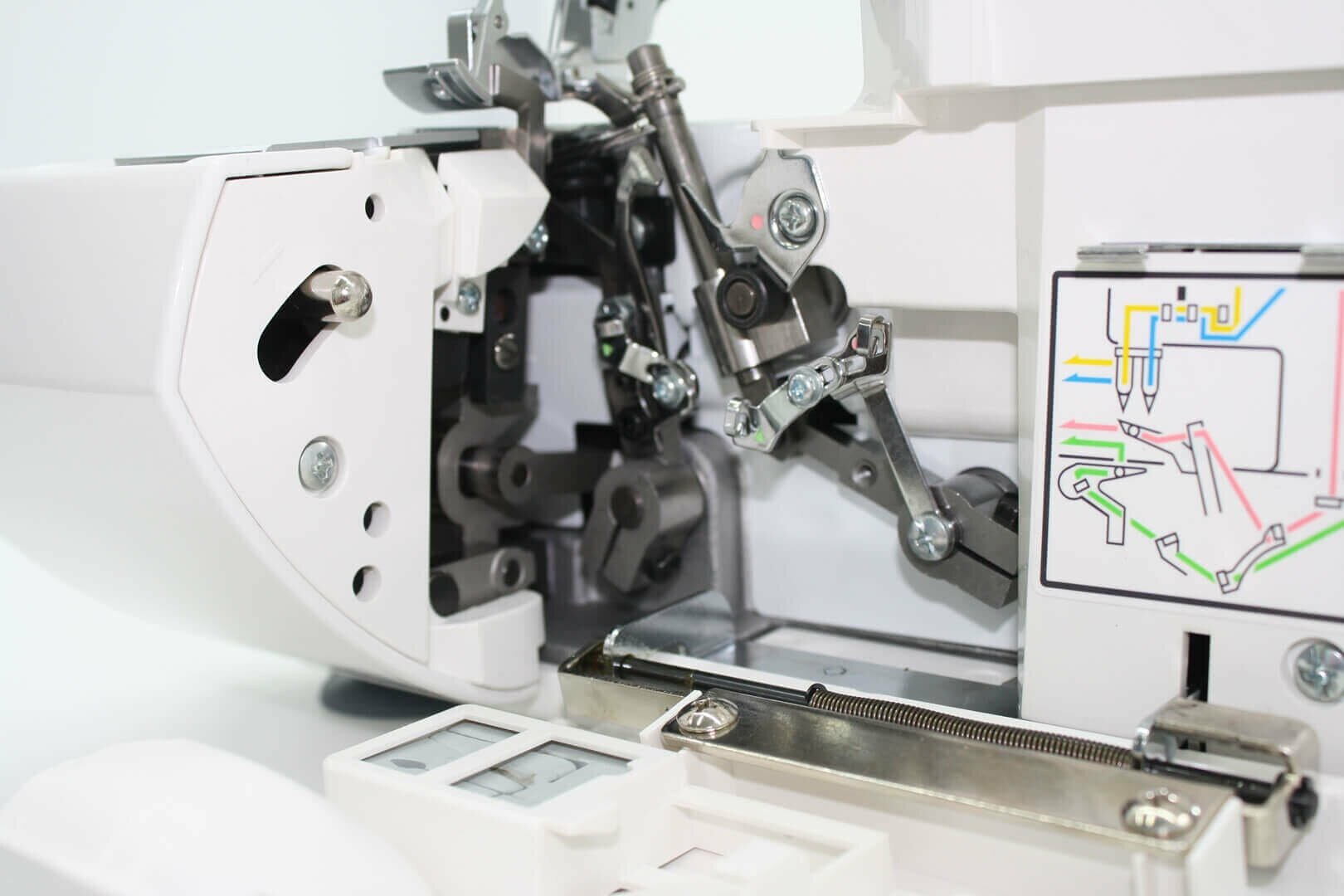 Особенности оверлока включают дифференциальный транспортер подачи ткани для посадки или растяжки трикотажного полотна, возможность отключения ножа, перенастройку на роликовый шов (опиковка), простую и понятную регулировку натяжения ниток, регулятор давления лапки на ткань и высокую скорость шитья до 1300 об/мин.