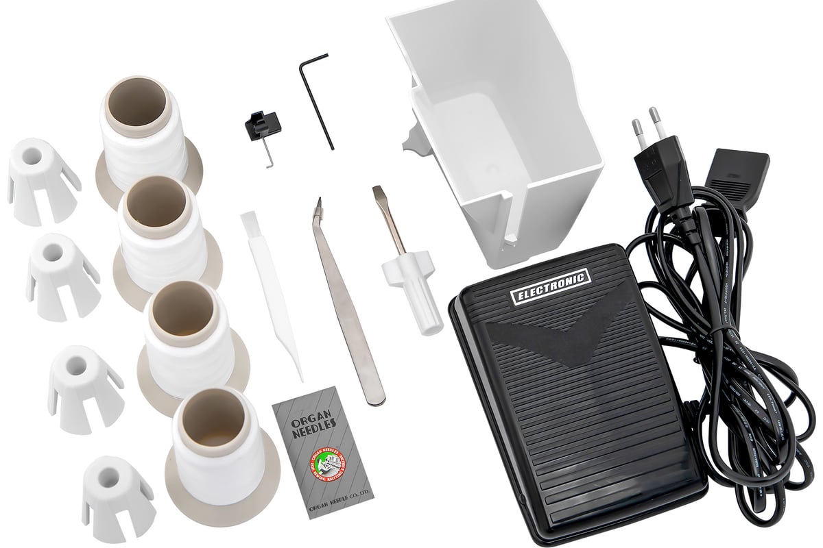АКСЕССУАРЫ В КОМПЛЕКТЕ - Педаль скорости, мусоросборник, 4 катушкодержателя и 4 катушки нитей, плоская отвертка, набор игл, шестигранная отвертка для замены игл, щеточка, пинцет, насадка для выполнения строчки в 2 нити
