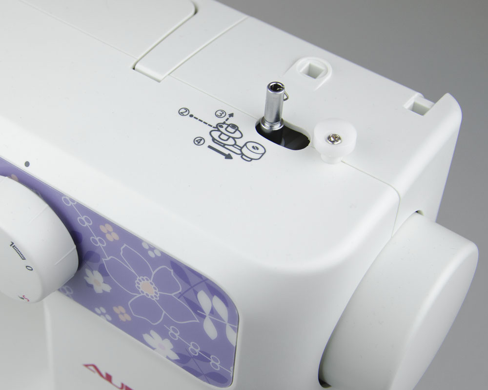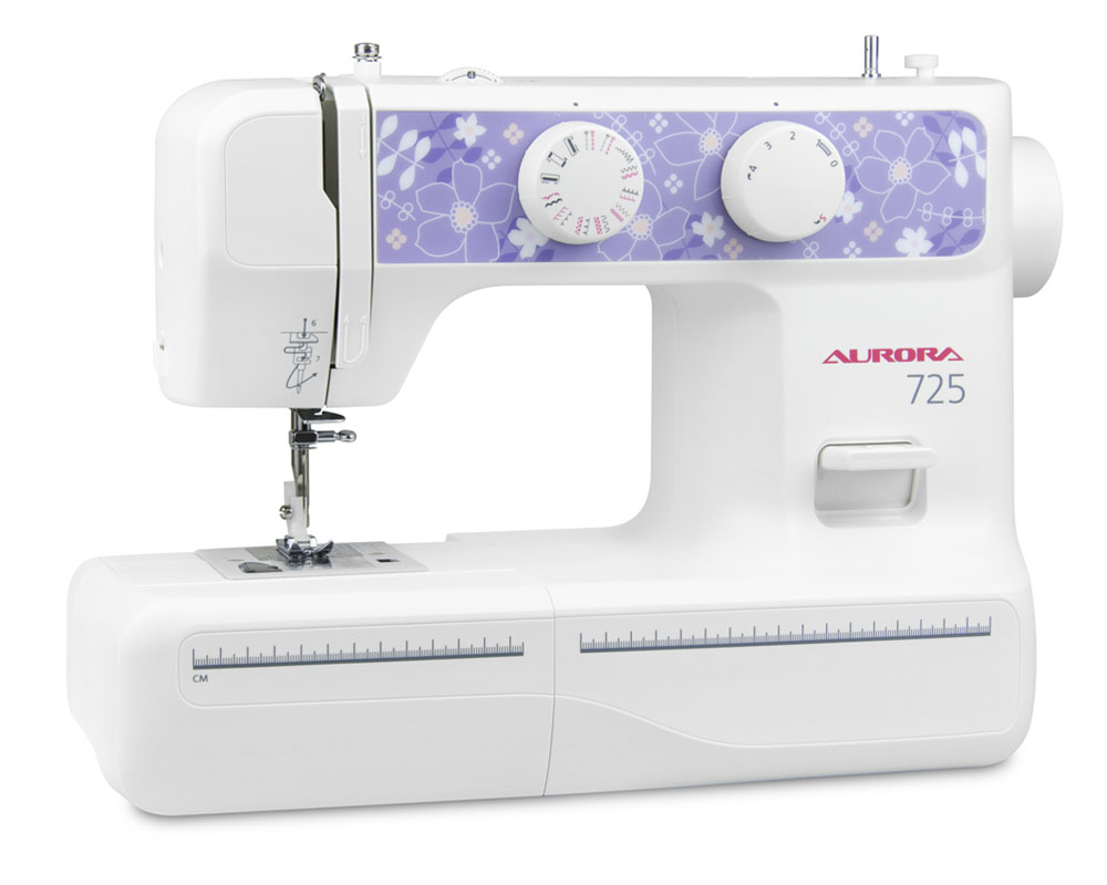 Швейная машина AURORA 725 оснащена горизонтальным челноком, имеет 19 швейных функций.