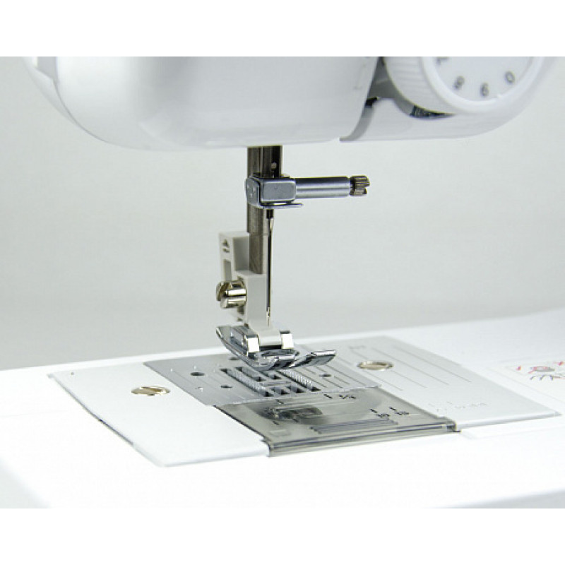 Модель оснащена светодиодной подсветкой рабочей зоны, что дает мягкий и приятный свет для комфортной работы. При помощи рычага на корпусе можно изменить направление шитья на реверсивное. Модель поддерживает шитье двойной иглой, что позволяет выполнять более качественные и профессиональные стежки. Сьемная рукавная платформа позволит работать с узкими деталями, такими как брючины, рукава и детские вещи. Аксессуары можно сложить в специальный отсек для хранения, и они будут всегда под рукой.