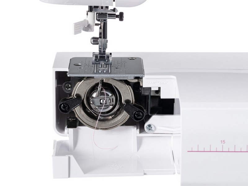 Данная модель обладает всем необходимым набором функций: 37 швейных операций для полноценного шитья. Петля выполняется в полуатоматическом режиме. Благодаря встроенному нитевдевателю можно без труда вдеть нить в иглу. Для пришивания пуговиц и выполнения свободно-ходовой стёжки есть переключатель нижнего транспортёра. Оснащена вертикальным классическим челночным устройством. Удобный переключатель швейных операций расположен на уровне глаз. Нажимая клавишу реверс, вы сможете шить в обратном направлении и сделать закрепку. На машинке можно прошивать широкий диапазон ткани: для плотного материала воспользуйтесь дополнительным подъёмом лапки, для узких изделий используйте рабочее пространство свободного рукава. Для комфортной работы в комплекте идут все необходимые аксессуары.