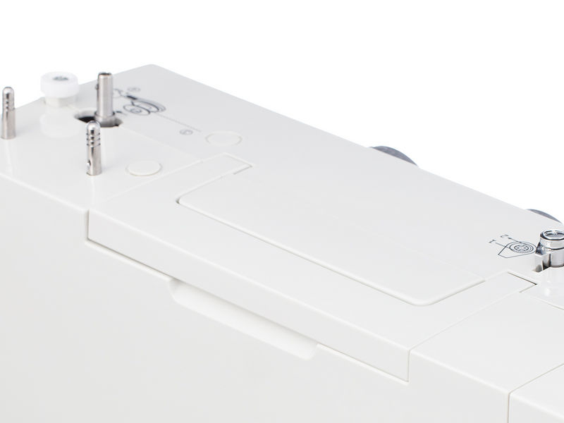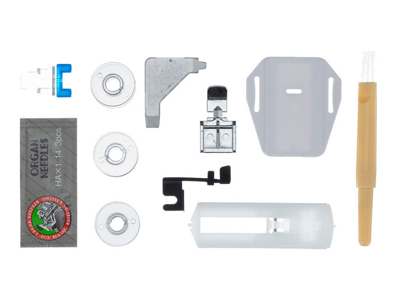 Для выполнения свободно-ходовой стёжки и пришивания пуговиц в комплекте идёт штопальная пластина, которая закрывает рейки нижнего транспортёра. В комплекте с машиной поставляются все необходимые аксессуары и расширительный столик, что делает работу с машиной ещё более комфортной